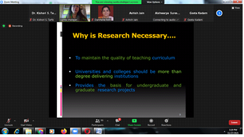 3. An online Guidelines talk on “Writing a successful research project for funding from Government of India” was organized on 27th November 2021. The main objective of the guidelines talk was to provide knowledge to participants about writing a successful research project for funding from government of India. The resource person for the work shop was Professor (Dr.) Sunita Shailajan, Principal Investigator DST-SERB (Gol), Freelancer Technical Consultant -Quality Council of India, Steering Committee Member -DBT-Star College scheme, Former Head, Department of Botany, Ramnarain Ruia College, Matunga. She started with the question what is Research? It’s advancing knowledge, collecting information, reporting new findings etc. Then she elaborated on – importance of research, Why a research proposal is important and Which topic should be selected, How one should start with research , idea of conceptualized, understanding thrust areas, What makes a good proposal?, How to structure proposal? Madam also discussed various projects showing her expertise and gave a detail account of various funding agencies like DBT, DST, NMPB etc.
